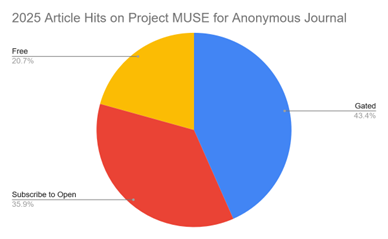 In the chart below, “free” is content that is temporarily freed for publicity purposes; “gated” is content that was accessed through a traditional subscription model, and “Subscribe to Open” is usage of the S2O issues published this year, all as a percentage of total usage. These three 2025 S2O issues received 35.9% of overall usage despite there being 20 volumes of content from this title on the MUSE platform (with MUSE’s S2O model, back content from the journal remained gated).