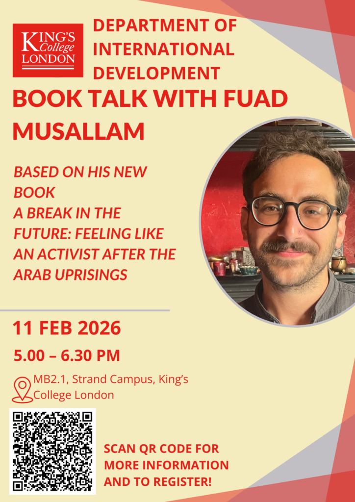 Fuad Masallam, author of A Break in the Future, will give a talk hosted by King’s College London as part of their Interrogating Development series on Wednesday, February 11, 2026 at 5 p.m. GMT.